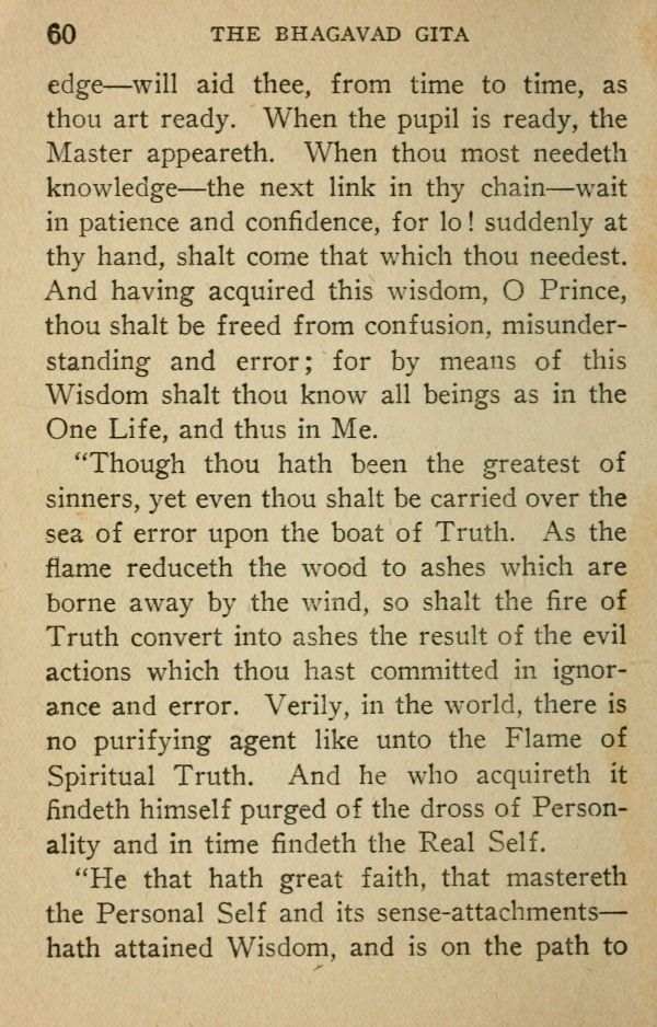 "Though thou hath been the greatest of sinners, yet even thou shalt be carried over the sea of error upon the boat of Truth. As the flame reduceth the wood to ashes which are borne away by the wind, so shalt the fire of Truth convert into ashes the result of the evil actions which thou hast committed in ignorance and error. Verily, in the world, there is no purifying agent like unto the Flame of Spiritual Truth. And he who acquireth it findeth himself purged of the dross of Personality and in time findeth the Real Self.