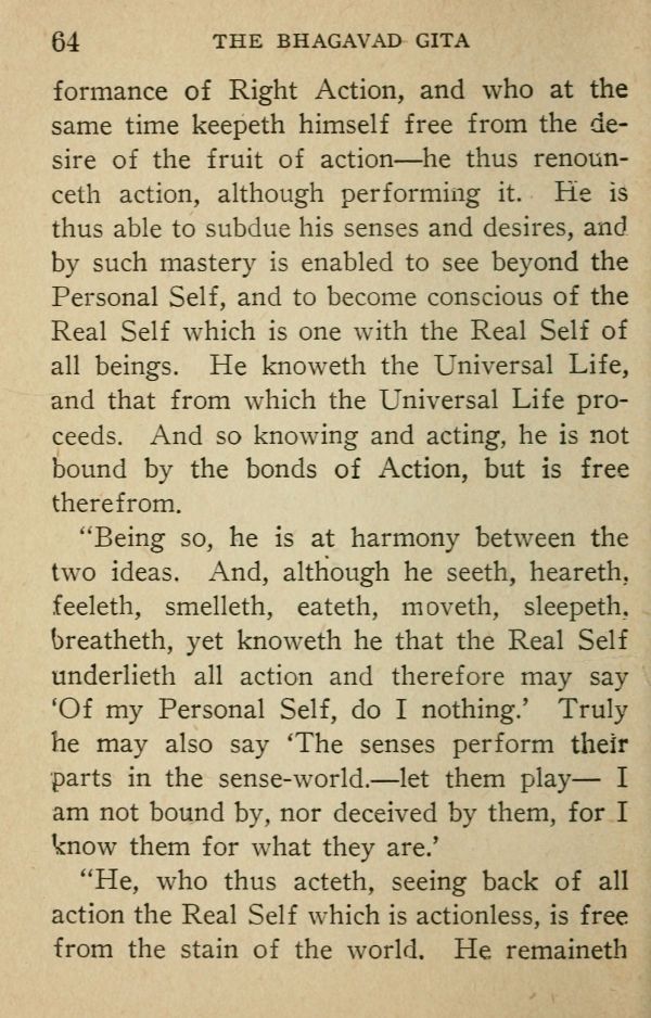 of Right Action, and who at the same time keepeth himself free from the desire of the fruit of action --- he thus renounced action, although performing it. He is thus able to subdue his senses and desires, and by such mastery is enabled to see beyond the Personal Self, and to become conscious of the Real Self which is one with the Real Self of all beings. He knoweth the Universal Life, and that from which the Universal Life proceeds. And so knowing and acting, he is not bound by the bonds of Action, but is free therefrom.