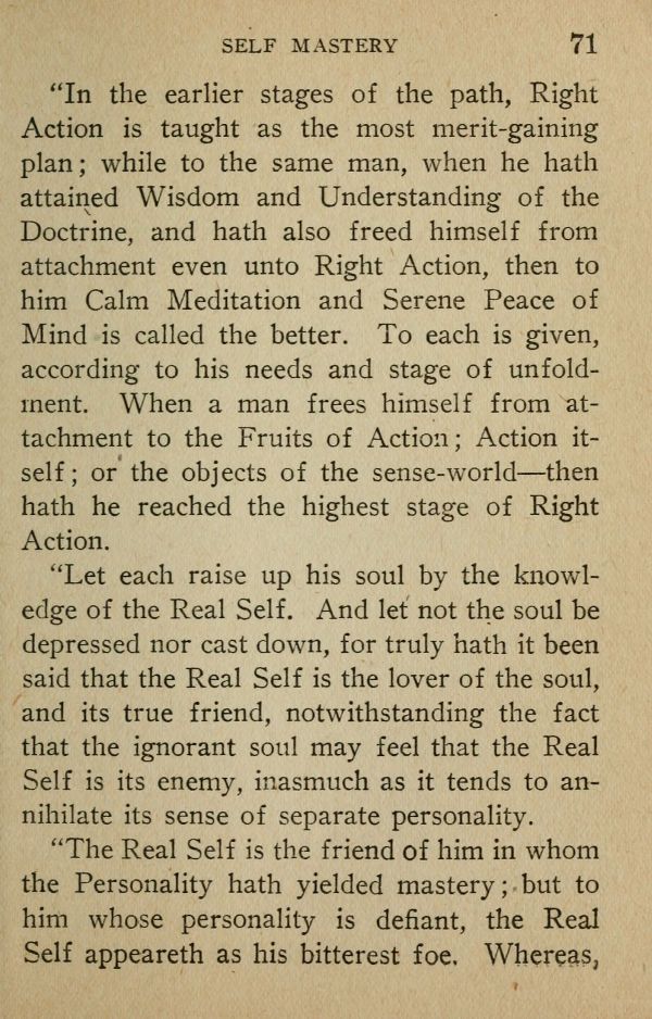 "In the earlier stages of the path, Right Action is taught as the most merit-gaining plan; while to the same man, when he hath attained Wisdom and Understanding of the Doctrine, and hath also freed himself from attachment even unto Right Action, then to him Calm Meditation and Serene Peace of Mind is called the better. To each is given, according to his needs and stage of unfoldment. When a man frees himself from attachment to the Fruits of Action; Action itself; or the objects of the sense-world --- then hath he reached the highest stage of Right Action.
