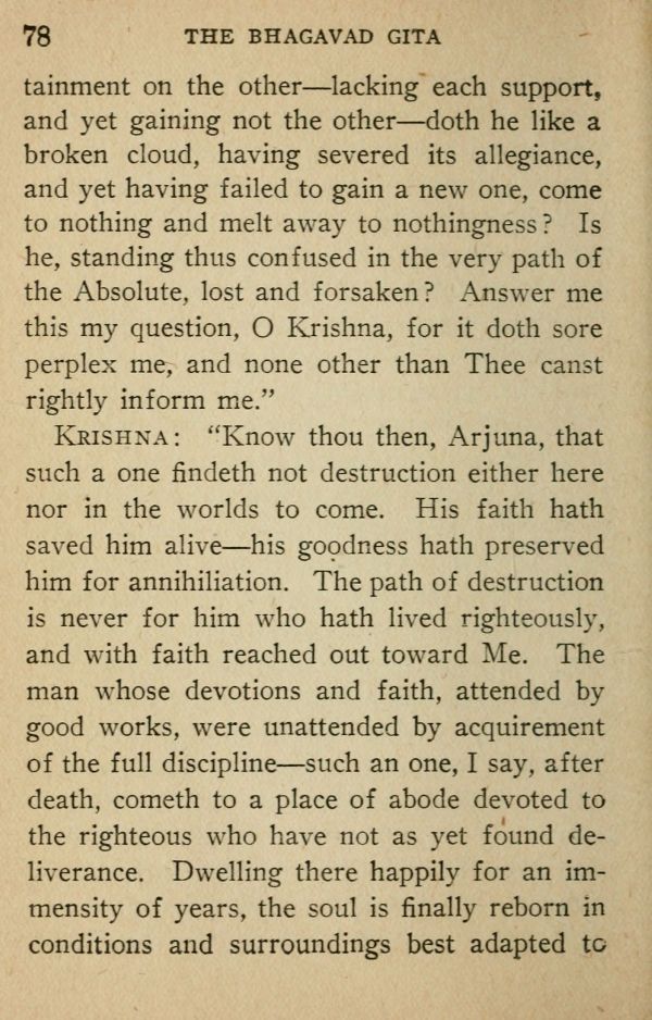 Krishna: "Know thou then, Arjuna, that such a one findeth not destruction either here nor in the worlds to come. His faith hath saved him alive --- his goodness hath preserved him for annihilation. The path of destruction is never for him who hath lived righteously, and with faith reached out toward Me. The man whose devotions and faith, attended by good works, were unattended by acquirement of the full discipline --- such an one, I say, after death, cometh to a place of abode devoted to the righteous who have not as yet found deliverance. Dwelling there happily for an immensity of years, the soul is finally reborn in conditions and surroundings best adapted to
