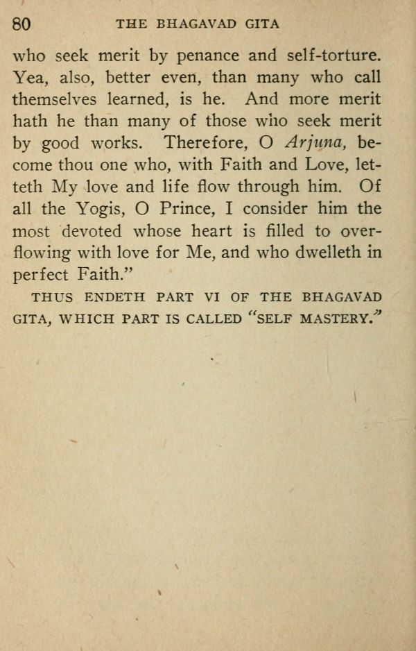 THUS ENDETH PART VI OF THE BHAGAVAD GITA, WHICH PART IS CALLED "SELF MASTERY"