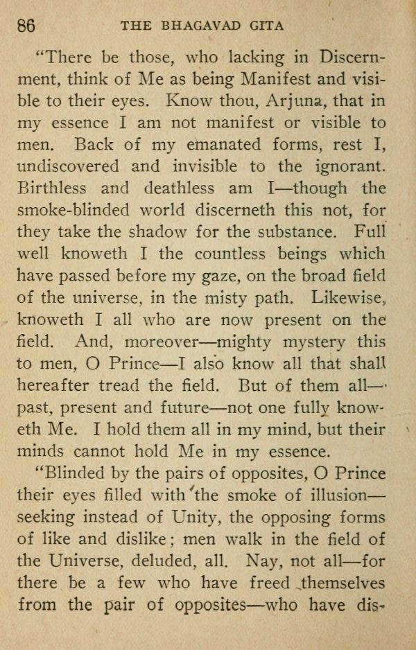 ''There be those, who lacking in Discernment, think of Me as being Manifest and visible to their eyes. Know thou, Arjuna, that in my essence I am not manifest or visible to men. Back of my emanated forms, rest I, undiscovered and invisible to the ignorant. Birthless and deathless am I --- though the smoke-blinded world discerneth this not, for they take the shadow for the substance. Full well knoweth I the countless beings which have passed before my gaze, on the broad field of the universe, in the misty path. Likewise, knoweth I all who are now present on the field. And, moreover --- mighty mystery this to men, O Prince --- I also know all that shall hereafter tread the field. But of them all -- past, present and future --- not one fully knoweth Me. I hold them all in my mind, but their minds cannot hold Me in my essence.