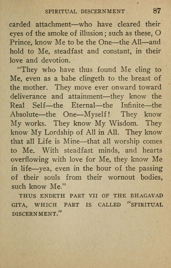 THUS ENDETH PART VII OF THE BHAGAVAD GITA, WHICH PART IS CALLED "SPIRITUAL DISCERNMENT."