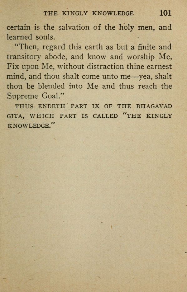 "THUS ENDETH PART IX OF THE BHAGAVAD GITA, WHICH PART IS CALLED "THE KINGLY KNOWLEDGE"