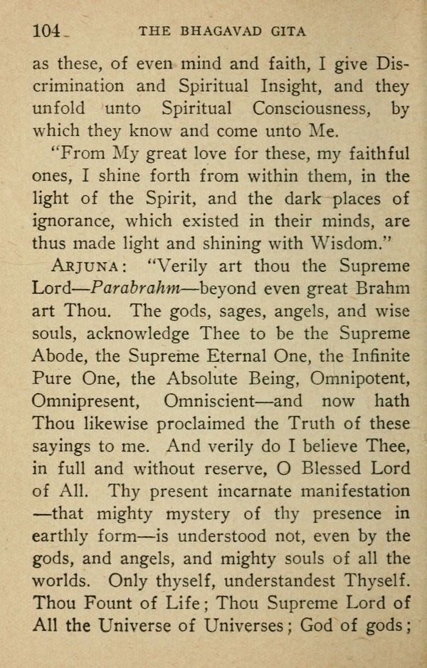 Arjuna: "Verily art thou the Supreme Lord --- Parabrahm --- beyond even great Brahm art Thou. The gods, sages, angels, and wise souls, acknowledge Thee to be the Supreme Abode, the Supreme Eternal One, the Infinite Pure One, the Absolute Being, Omnipotent, Omnipresent, Omniscient --- and now hath Thou likewise proclaimed the Truth of these sayings to me. And verily do I believe Thee, in full and without reserve, O Blessed Lord of All. Thy present incarnate manifestation --- that mighty mystery of thy presence in earthly form --- is understood not, even by the gods, and angels, and mighty souls of all the worlds. Only thyself, understandest Thyself. Thou Fount of Life; Thou Supreme Lord of All the Universe of Universes; God of gods;