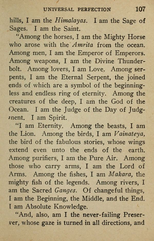 "I am Eternity. Among the beasts, I am the Lion. Among the birds, I am Vainateya, the bird of the fabulous stories, whose wings extend even unto the ends of the earth. Among purifiers, I am the Pure Air. Among those who carry arms, I am the Lord of Arms. Among the fishes, I am Makara, the mighty fish of the legends. Among rivers, I am the Sacred Ganges. Of changeful things, I am the Beginning, the Middle, and the End. I am Absolute Knowledge.