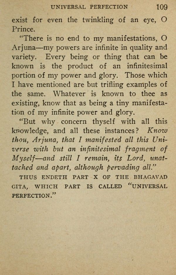 THUS ENDETH PART X OF THE BHAGAVAD GITA, WHICH PART IS CALLED "UNIVERSAL PERFECTION."