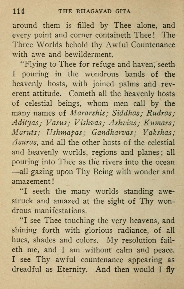 "Flying to Thee for refuge and haven, seeth I pouring in the wondrous bands of the heavenly hosts, with joined palms and reverent attitude. Cometh all the heavenly hosts of celestial beings, whom men call by the many names of Mararshis; Siddhas; Rudras; Adityas; Vasus; Vishvas; Ashvvis; Kumars; Maruts; Ushmapas; Gandharvas; Yakshas; Asuras, and all the other hosts of the celestial and heavenly worlds, regions and planes; all pouring into Thee as the rivers into the ocean --- all gazing upon Thy Being with wonder and amazement!