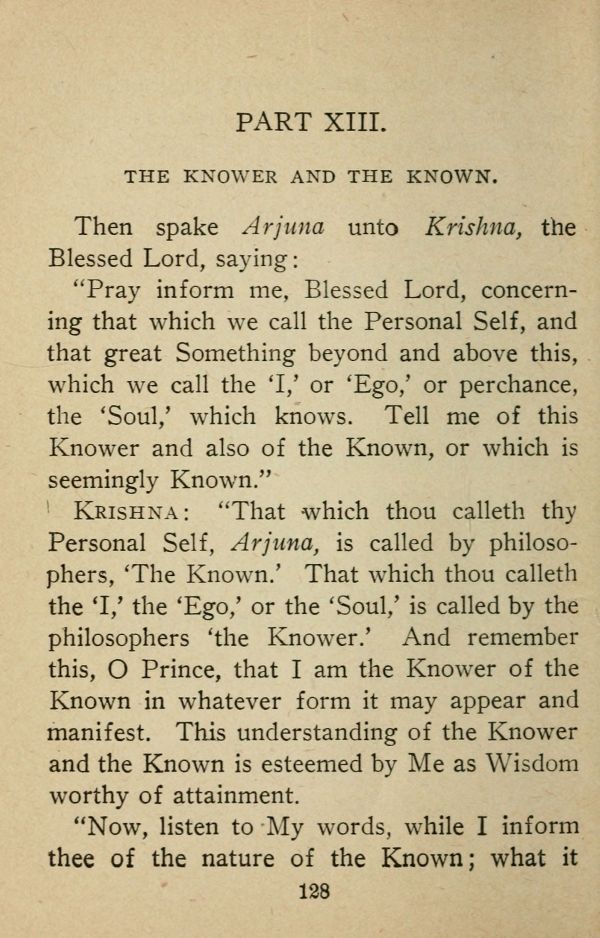 Krishna: 'That which thou calleth thy Personal Self, Arjuna, is called by philosophers, 'The Known.' That which thou calleth the T,' the 'Ego/ or the 'Soul/ is called by the philosophers 'the Knower.' And remember this, O Prince, that I am the Knower of the Known in whatever form it may appear and manifest. This understanding of the Knower and the Known is esteemed by Me as Wisdom worthy of attainment.