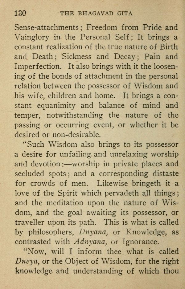 ''Such Wisdom also brings to its possessor a desire for unfailing, and unrelaxing worship and devotion: --- worship in private places and secluded spots; and a corresponding distaste for crowds of men. Likewise bringeth it a love of the Spirit which pervadeth all things; and the meditation upon the nature of Wisdom, and the goal awaiting its possessor, or traveller upon its path. This is what is called by philosophers, Dnyana, or Knowledge, as contrasted with Adnyana, or Ignorance.