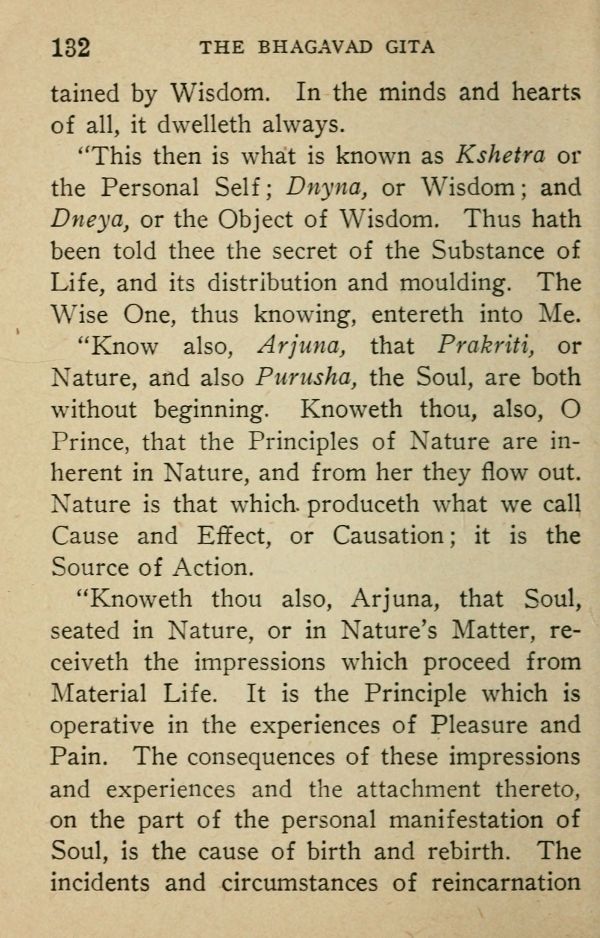 "Know also, Arjuna, that Prakriti, or Nature, and also Purusha, the Soul, are both without beginning. Knoweth thou, also, O Prince, that the Principles of Nature are inherent in Nature, and from her they flow out. Nature is that which, produceth what we call Cause and Effect, or Causation; it is the Source of Action.