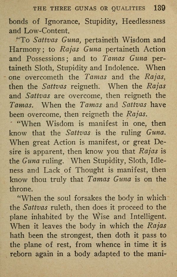 "When the soul forsakes the body in which the Sattvas ruleth, then does it proceed to the plane inhabited by the Wise and Intelligent. When it leaves the body in which the Rajas hath been the strongest, then doth it pass to the plane of rest, from whence in time it is reborn again in a body adapted to the manifestation