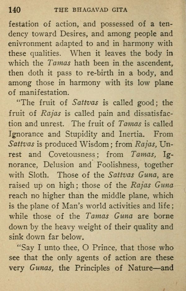 ''The fruit of Sattvas is called good; the fruit of Rajas is called pain and dissatisfaction and unrest. The fruit of Tamas is called Ignorance and Stupidity and Inertia. From Sattvas is produced Wisdom; from Rajas, Unrest and Covetousness; from Tamas, Ignorance, Delusion and Foolishness, together with Sloth. Those of the Sattvas Guna, are raised up on high; those of the Rajas Guna reach no higher than the middle plane, which is the plane of Man's world activities and life; while those of the Tamas Guna are borne down by the heavy weight of their quality and sink down far below.