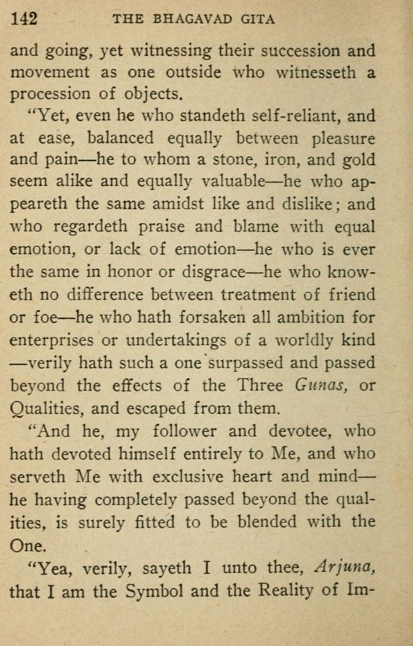 "Yet, even he who standeth self-reliant, and at ease, balanced equally between pleasure and pain --- he to whom a stone, iron, and gold seem alike and equally valuable --- he who appeareth the same amidst like and dislike; and who regardeth praise and blame with equal emotion, or lack of emotion --- he who is ever the same in honor or disgrace --- he who knoweth no difference between treatment of friend or foe --- he who hath forsaken all ambition for enterprises or undertakings of a worldly kind --- verily hath such a one surpassed and passed beyond the effects of the Three Gunas, or Qualities, and escaped from them.