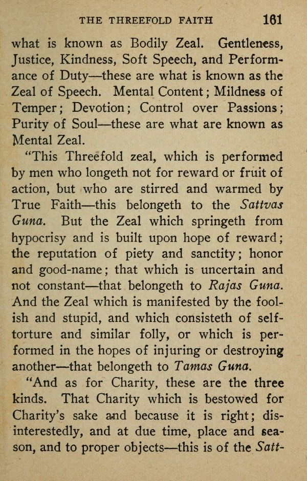 "This Threefold zeal, which is performed by men who longeth not for reward or fruit of action, but who are stirred and warmed by True Faith --- this belongeth to the Sattvas Guna. But the Zeal which springeth from hypocrisy and is built upon hope of reward; the reputation of piety and sanctity; honor and good-name; that which is uncertain and not constant --- that belongeth to Rajas Guna. And the Zeal which is manifested by the foolish and stupid, and which consisteth of self torture and similar folly, or which is performed in the hopes of injuring or destroying another --- that belongeth to Tamas Guna.