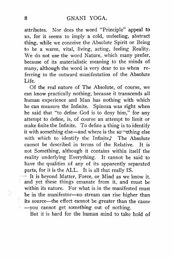 Of the real nature of The Absolute, of course, we can know practically nothing, because it transcends all human experience and Man has nothing with which he can measure the Infinite.Spinoza was right when he said that "to define God is to deny him," for any attempt to define, is, of course an attempt to limit or make finite the Infinite. To define a thing is to identify it with something else --- and where is the something else with which to identify the Infinite. The Absolute cannot be described in terms of the Relative. It is not Something, although it contains within itself the reality underlying Everything. It cannot be said to have the qualities of any of its apparently separated parts, for it is the ALL. It is all that really IS. --- It is beyond Matter, Force, or Mind as we know it, and yet these things emanate from it, and must be within its nature. For what is in the manifested must be in the manifestor --- no stream can rise higher than its source --- the effect cannot be greater than the cause --- you cannot get something out of nothing.