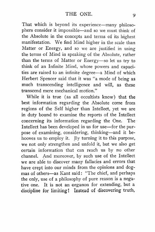 While it is true (as all occultists know) that the best information regarding the Absolute come from regions of the Self higher than Intellect, yet we are in duty bound to examine the reports of the Intellect concerning its information regarding the One. The Intellect has been developed in us for use --- for the purpose of examining, considering, thinking --- and it behooves us to employ it. By turning it to this purpose, we not only strengthen and unfold it, but we also get certain information that can reach us by no other channel. And moreover, by such use of the Intellect we are able to discover many fallacies and errors that have crept into our minds from the opinions and dogmas of others --- as Kant said: "The chief, and perhaps the only, use of a philosophy of pure reason is a negative one. It is not an organon for extending, but a discipline for limiting! Instead of discovering truth,