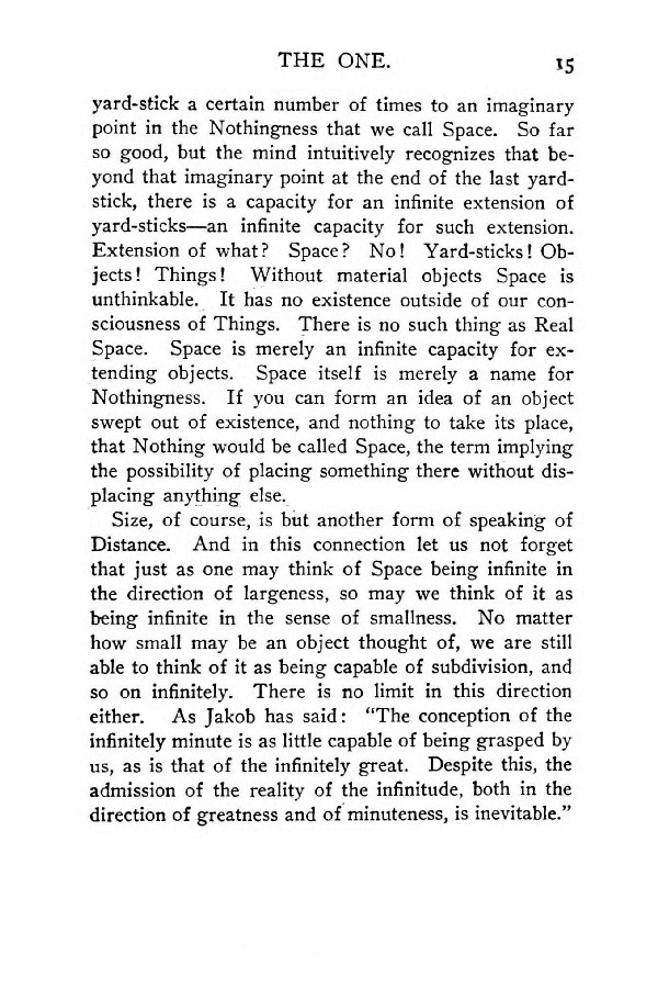 Size, of course, is but another form of speaking of Distance. And in this connection let us not forget that just as one may think of Space being infinite in the direction of largeness, so may we think of it as being infinite in the sense of smallness. No matter how small may be an object thought of, we are still able to think of it as being capable of subdivision, and so on infinitely. There is no limit in this direction either. As Jakob has said: "The conception of the infinitely minute is as little capable of being grasped by us, as is that of the infinitely great. Despite this, the admission of the reality of the infinitude, both in the direction of greatness and of minuteness, is inevitable."