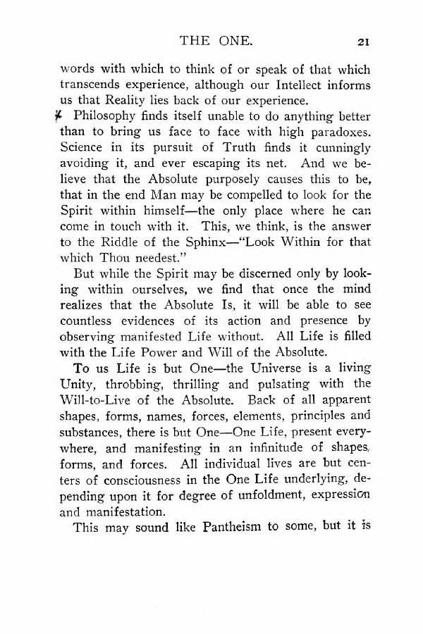 Philosophy finds itself unable to do anything better than to bring us face to face with high paradoxes. Science in its pursuit of Truth finds it cunningly avoiding it, and ever escaping its net. And we believe that the Absolute purposely causes this to be, that in the end Man may be compelled to look for the Spirit within himself --- the only place where he can come in touch with it. This, we think, is the answer to the Riddle of the Sphinx --- "Look Within for that which Thou needest."