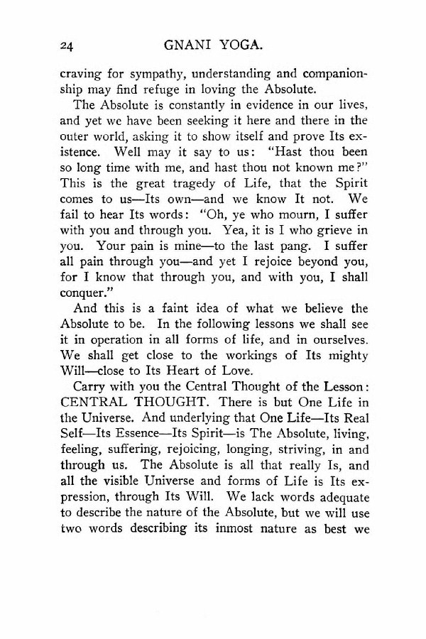 The Absolute is constantly in evidence in our lives, and yet we have been seeking it here and there in the outer world, asking it to show itself and prove Its existence. Well may it say to us: "Hast thou been so long time with me, and hast thou not known me?" This is the great tragedy of Life, that the Spirit comes to us --- Its own --- and we know It not. We fail to hear Its words: "Oh, ye who mourn, I suffer with you and through you. Yea, it is I who grieve in you. Your pain is mine --- to the last pang. I suffer all pain through you --- and yet I rejoice beyond you, for I know that through you, and with you, I shall conquer."