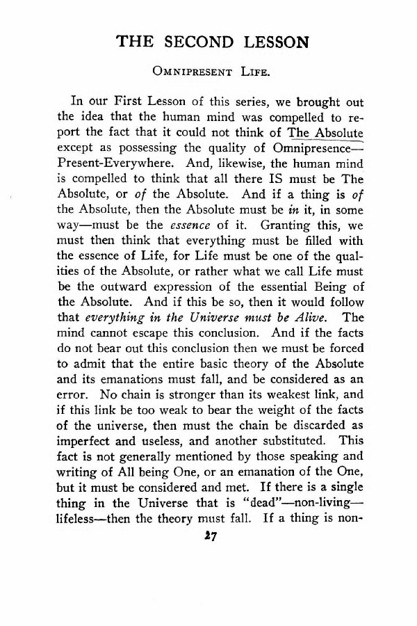 In our First Lesson of this series, we brought out the idea that the human mind was compelled to report the fact that it could not think of The Absolute except as possessing the quality of Omnipresence --- Present-Everywhere. And, likewise, the human mind is compelled to think that all there IS must be The Absolute, or of the Absolute. And if a thing is of the Absolute, then the Absolute must be in it, in some way --- must be the essence of it. Granting this, we must then think that everything must be filled with the essence of Life, for Life must be one of the qualities of the Absolute, or rather what we call Life must be the outward expression of the essential Being of the Absolute. And if this be so, then it would follow that everything in the Universe must be Alive. The mind cannot escape this conclusion. And if the facts do not bear out this conclusion then we must be forced to admit that the entire basic theory of the Absolute and its emanations must fall, and be considered as an error. No chain is stronger than its weakest link, and if this link be too weak to bear the weight of the facts of the universe, then must the chain be discarded as imperfect and useless, and another substituted. This fact is not generally mentioned by those speaking and writing of All being One, or an emanation of the One, but it must be considered and met. If there is a single thing in the Universe that is "dead" --- non-living --- lifeless --- then the theory must fall. If a thing is non-living,