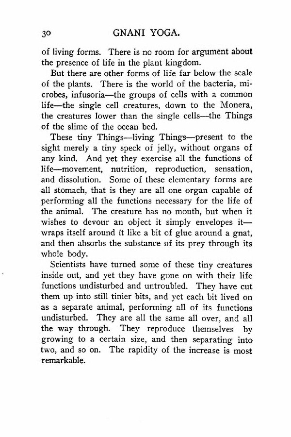 But there are other forms of life far below the scale of the plants. There is the world of the bacteria, microbes, infusoria --- the groups of cells with a common life --- the single cell creatures, down to the Monera, the creatures lower than the single cells --- the Things of the slime of the ocean bed.