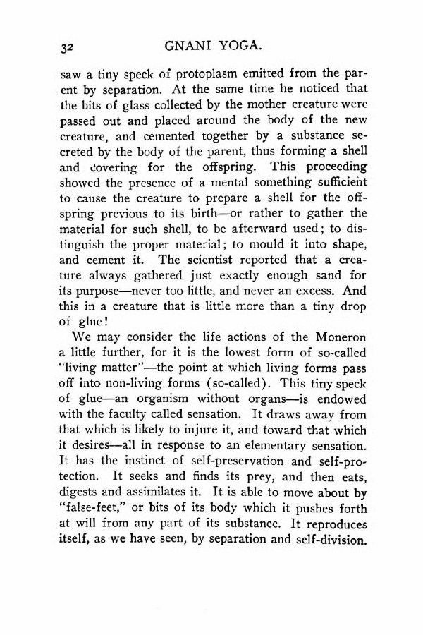 We may consider the life actions of the Moneron a little further, for it is the lowest form of so-called "living matter" --- the point at which living forms pass off into non-living forms (so-called). This tiny speck of glue --- an organism without organs --- is endowed with the faculty called sensation. It draws away from that which is likely to injure it, and toward that which it desires --- all in response to an elementary sensation. It has the instinct of self-preservation and self-protection. It seeks and finds its prey, and then eats, digests and assimilates it. It is able to move about by "false-feet," or bits of its body which it pushes forth at will from any part of its substance. It reproduces itself, as we have seen, by separation and self-division.
