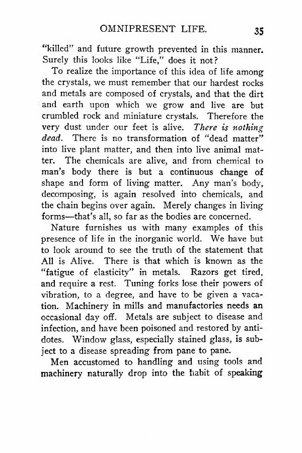 To realize the importance of this idea of life among the crystals, we must remember that our hardest rocks and metals are composed of crystals, and that the dirt and earth upon which we grow and live are but crumbled rock and miniature crystals. Therefore the very dust under our feet is alive. There is nothing dead. There is no transformation of "dead matter" into live plant matter, and then into live animal matter. The chemicals are alive, and from chemical to man's body there is but a continuous change of shape and form of living matter. Any man's body, decomposing, is again resolved into chemicals, and the chain begins over again. Merely changes in living forms --- that's all, so far as the bodies are concerned.