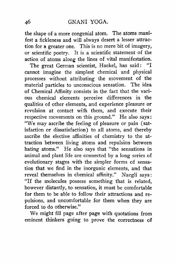 The great German scientist, Haekel, has said: "I cannot imagine the simplest chemical and physical processes without attributing the movement of the material particles to unconscious sensation. The idea of Chemical Affinity consists in the fact that the various chemical elements perceive differences in the qualities of other elements, and experience pleasure or revulsion at contact with them, and execute their respective movements on this ground." He also says: "We may ascribe the feeling of pleasure or pain (satisfaction or dissatisfaction) to all atoms, and thereby ascribe the elective affinities of chemistry to the attraction between living atoms and repulsion between hating atoms." He also says that "the sensations in animal and plant life are connected by a long series of evolutionary stages with the simpler forms of sensation that we find in the inorganic elements, and that reveal themselves in chemical affinity." Naegli says: "If the molecules possess something that is related, however distantly, to sensation, it must be comfortable for them to be able to follow their attractions and repulsions, and uncomfortable for them when they are forced to do otherwise."