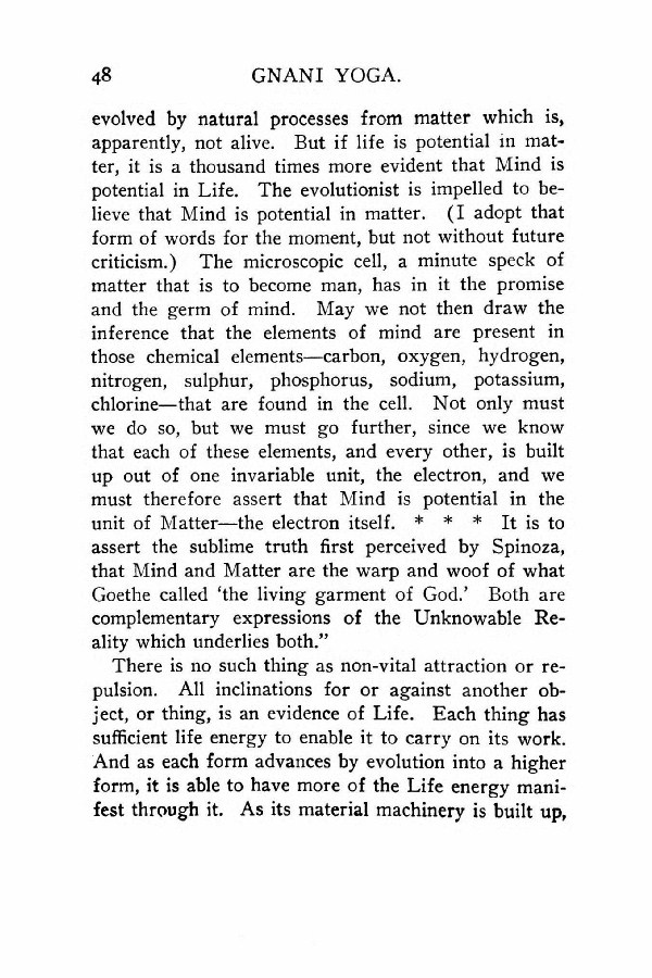 evolved by natural processes from matter which is, apparently, not alive. But if life is potential in matter, it is a thousand times more evident that Mind is potential in Life. The evolutionist is impelled to believe that Mind is potential in matter. (I adopt that form of words for the moment, but not without future criticism.) The microscopic cell, a minute speck of matter that is to become man, has in it the promise and the germ of mind. May we not then draw the inference that the elements of mind are present in those chemical elements --- carbon, oxygen, hydrogen, nitrogen, sulphur, phosphorus, sodium, potassium, chlorine --- that are found in the cell. Not only must we do so, but we must go further, since we know that each of these elements, and every other, is built up out of one invariable unit, the electron, and we must therefore assert that Mind is potential in the unit of Matter --- the electron itself. * * * It is to assert the sublime truth first perceived by Spinoza, that Mind and Matter are the warp and woof of what Goethe called 'the living garment of God.' Both are complementary expressions of the Unknowable Reality which underlies both."
