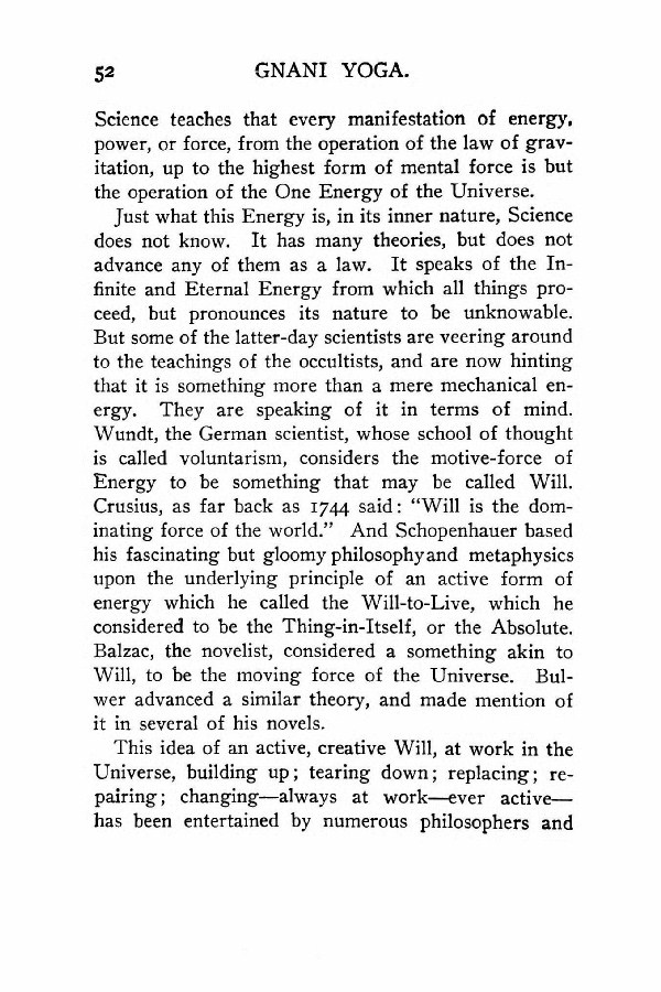 Just what this Energy is, in its inner nature, Science does not know. It has many theories, but does not advance any of them as a law. It speaks of the Infinite and Eternal Energy from which all things proceed, but pronounces its nature to be unknowable. But some of the latter-day scientists are veering around to the teachings of the occultists, and are now hinting that it is something more than a mere mechanical energy. They are speaking of it in terms of mind.Wundt, the German scientist, whose school of thought is called voluntarism, considers the motive-force of Energy to be something that may be called Will. Crusius, as far back as 1744 said: "Will is the dominating force of the world." And Schopenhauer based his fascinating but gloomy philosophy and metaphysics upon the underlying principle of an active form of energy which he called the Will-to-Live, which he considered to be the Thing-in-Itself, or the Absolute.Balzac, the novelist, considered a something akin to Will, to be the moving force of the Universe. Bulwer advanced a similar theory, and made mention of it in several of his novels.