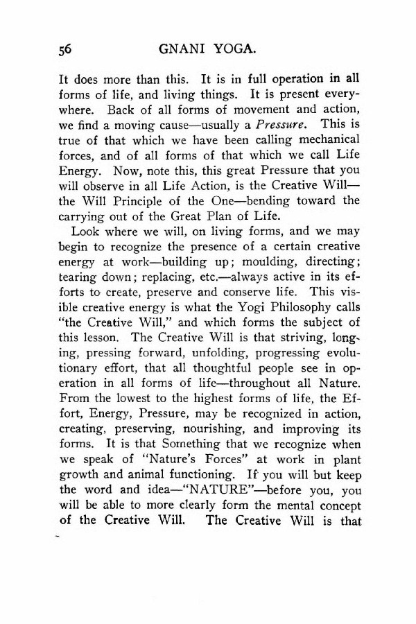 Look where we will, on living forms, and we may begin to recognize the presence of a certain creative energy at work --- building up; moulding, directing; tearing down; replacing, etc. --- always active in its efforts to create, preserve and conserve life. This visible creative energy is what the Yogi Philosophy calls "the Creative Will," and which forms the subject of this lesson. The Creative Will is that striving, longing, pressing forward, unfolding, progressing evolutionary effort, that all thoughtful people see in operation in all forms of life --- throughout all Nature. From the lowest to the highest forms of life, the Effort, Energy, Pressure, may be recognized in action, creating, preserving, nourishing, and improving its forms. It is that Something that we recognize when we speak of "Nature's Forces" at work in plant growth and animal functioning. If you will but keep the word and idea --- "NATURE" --- before you, you will be able to more clearly form the mental concept of the Creative Will. The Creative Will is that