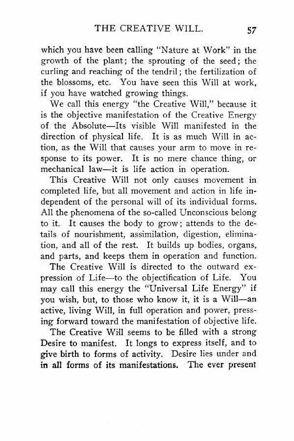 We call this energy "the Creative Will," because it is the objective manifestation of the Creative Energy of the Absolute --- Its visible Will manifested in the direction of physical life. It is as much Will in action, as the Will that causes your arm to move in response to its power. It is no mere chance thing, or mechanical law --- it is life action in operation.