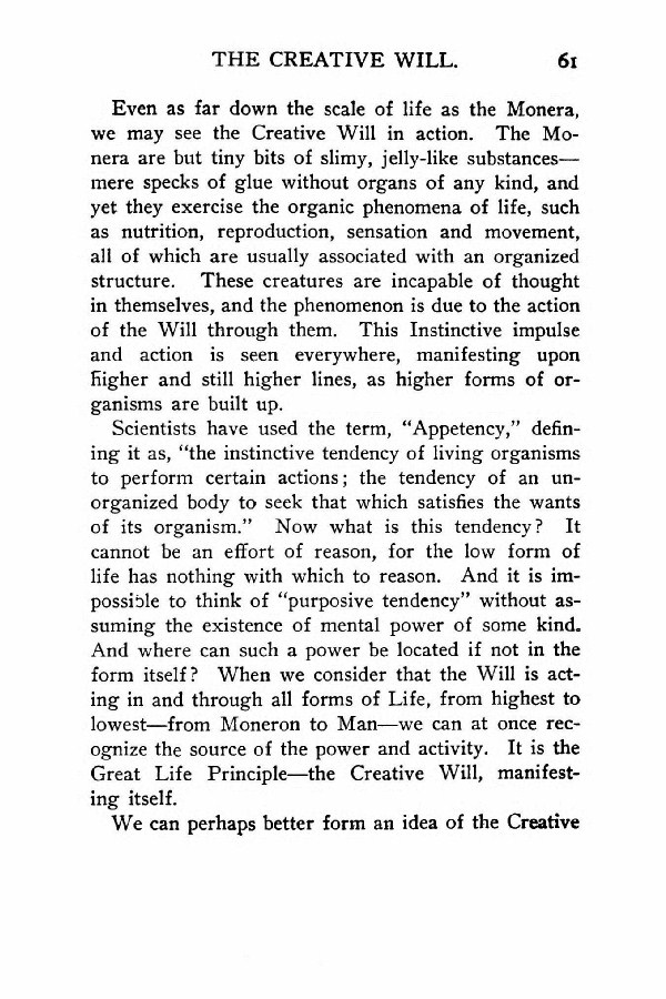Scientists have used the term, "Appetency," defining it as, "the instinctive tendency of living organisms to perform certain actions; the tendency of an unorganized body to seek that which satisfies the wants of its organism." Now what is this tendency? It cannot be an effort of reason, for the low form of life has nothing with which to reason. And it is impossible to think of "purposive tendency" without assuming the existence of mental power of some kind. And where can such a power be located if not in the form itself? When we consider that the Will is acting in and through all forms of Life, from highest to lowest --- from Moneron to Man --- we can at once recognize the source of the power and activity. It is the Great Life Principle --- the Creative Will, manifesting itself.