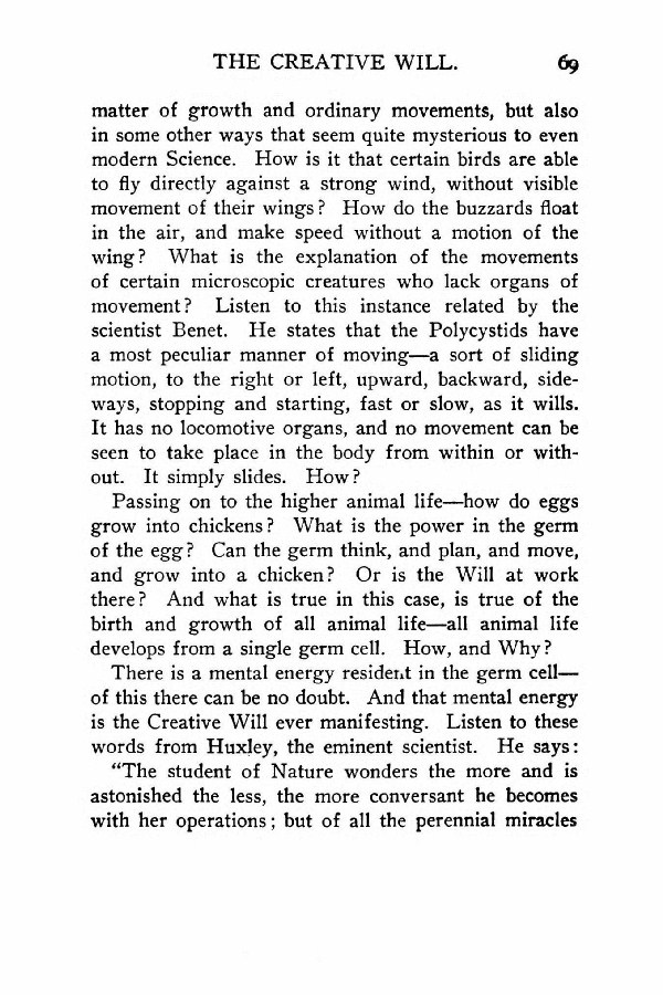 matter of growth and ordinary movements, but also in some other ways that seem quite mysterious to even modern Science. How is it that certain birds are able to fly directly against a strong wind, without visible movement of their wings? How do the buzzards float in the air, and make speed without a motion of the wing? What is the explanation of the movements of certain microscopic creatures who lack organs of movement? Listen to this instance related by the scientist Benet. He states that the Polycystids have a most peculiar manner of moving --- a sort of sliding motion, to the right or left, upward, backward, sideways, stopping and starting, fast or slow, as it wills. It has no locomotive organs, and no movement can be seen to take place in the body from within or without. It simply slides. How?