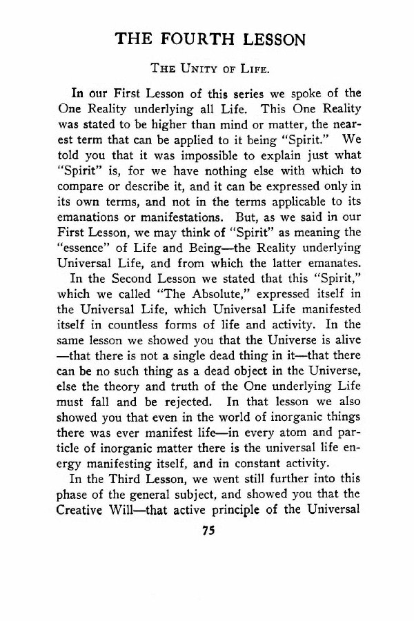 In the Second Lesson we stated that this "Spirit," which we called "The Absolute," expressed itself in the Universal Life, which Universal Life manifested itself in countless forms of life and activity. In the same lesson we showed you that the Universe is alive --- that there is not a single dead thing in it --- that there can be no such thing as a dead object in the Universe, else the theory and truth of the One underlying Life must fall and be rejected. In that lesson we also showed you that even in the world of inorganic things there was ever manifest life --- in every atom and particle of inorganic matter there is the universal life energy manifesting itself, and in constant activity.