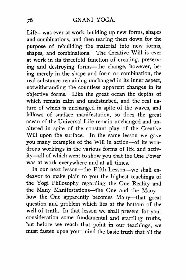 In our next lesson --- the Fifth Lesson --- we shall endeavor to make plain to you the highest teachings of the Yogi Philosophy regarding the One Reality and the Many Manifestations --- the One and the Many --- how the One apparently becomes Many --- that great question and problem which lies at the bottom of the well of truth. In that lesson we shall present for your consideration some fundamental and startling truths, but before we reach that point in our teachings, we must fasten upon your mind the basic truth that all the