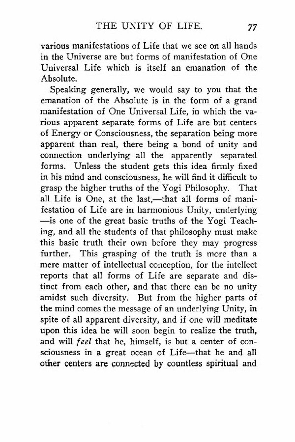 Speaking generally, we would say to you that the emanation of the Absolute is in the form of a grand manifestation of One Universal Life, in which the various apparent separate forms of Life are but centers of Energy or Consciousness, the separation being more apparent than real, there being a bond of unity and connection underlying all the apparently separated forms. Unless the student gets this idea firmly fixed in his mind and consciousness, he will find it difficult to grasp the higher truths of the Yogi Philosophy. That all Life is One, at the last, --- that all forms of manifestation of Life are in harmonious Unity, underlying --- is one of the great basic truths of the Yogi Teaching, and all the students of that philosophy must make this basic truth their own before they may progress further. This grasping of the truth is more than a mere matter of intellectual conception, for the intellect reports that all forms of Life are separate and distinct from each other, and that there can be no unity amidst such diversity. But from the higher parts of the mind comes the message of an underlying Unity, in spite of all apparent diversity, and if one will meditate upon this idea he will soon begin to realize the truth, and will feel that he, himself, is but a center of consciousness in a great ocean of Life --- that he and all other centers are connected by countless spiritual and