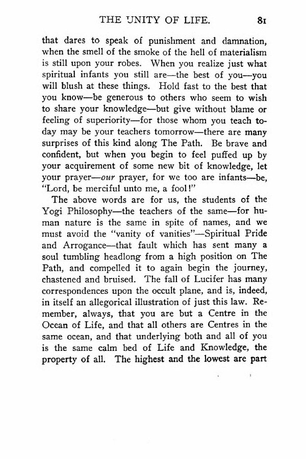 The above words are for us, the students of the Yogi Philosophy --- the teachers of the same --- for human nature is the same in spite of names, and we must avoid the "vanity of vanities" --- Spiritual Pride and Arrogance --- that fault which has sent many a soul tumbling headlong from a high position on The Path, and compelled it to again begin the journey, chastened and bruised. The fall of Lucifer has many correspondences upon the occult plane, and is, indeed, in itself an allegorical illustration of just this law. Remember, always, that you are but a Centre in the Ocean of Life, and that all others are Centres in the same ocean, and that underlying both and all of you is the same calm bed of Life and Knowledge, the property of all. The highest and the lowest are part