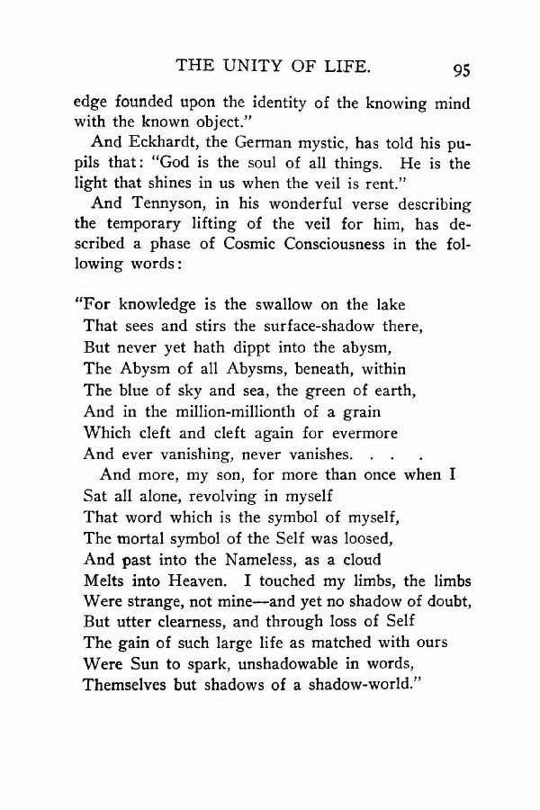And Tennyson, in his wonderful verse describing the temporary lifting of the veil for him, has described a phase of Cosmic Consciousness in the following words: