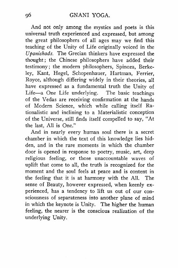 And not only among the mystics and poets is this universal truth experienced and expressed, but among the great philosophers of all ages may we find this teaching of the Unity of Life originally voiced in the Upanishads. The Grecian thinkers have expressed the thought; the Chinese philosophers have added their testimony; the modern philosophers, Spinoza, Berkeley,Kant, Hegel, Schopenhauer, Hartman, Ferrier, Royce, although differing widely in their theories, all have expressed as a fundamental truth the Unity of Life --- a One Life underlying. The basic teachings of the Vedas are receiving confirmation at the hands of Modern Science, which while calling itself Rationalistic and inclining to a Materialistic conception of the Universe, still finds itself compelled to say, "At the last, All is One."