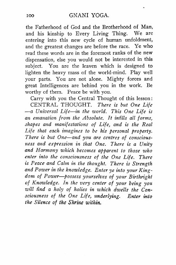 the Fatherhood of God and the Brotherhood of Man, and his kinship to Every Living Thing. We are entering into this new cycle of human unfoldment, and the greatest changes are before the race. Ye who read these words are in the foremost ranks of the new dispensation, else you would not be interested in this subject. You are the leaven which is designed to lighten the heavy mass of the world-mind. Play well your parts. You are not alone. Mighty forces and great Intelligences are behind you in the work. Be worthy of them. Peace be with you.