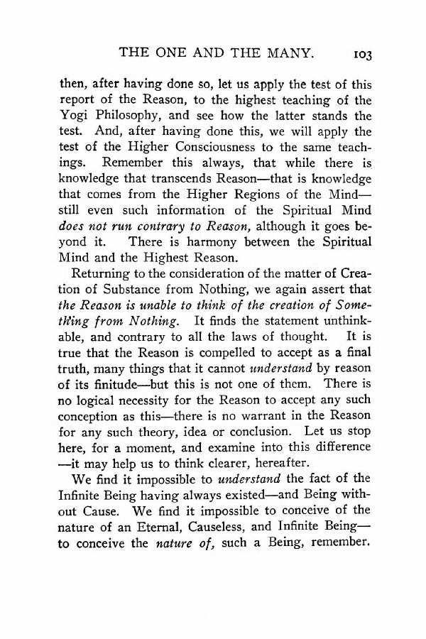 Returning to the consideration of the matter of Creation of Substance from Nothing, we again assert that the Reason is unable to think of the creation of Something from Nothing. It finds the statement unthinkable, and contrary to all the laws of thought. It is true that the Reason is compelled to accept as a final truth, many things that it cannot understand by reason of its finitude --- but this is not one of them. There is no logical necessity for the Reason to accept any such conception as this --- there is no warrant in the Reason for any such theory, idea or conclusion. Let us stop here, for a moment, and examine into this difference --- it may help us to think clearer, hereafter.
