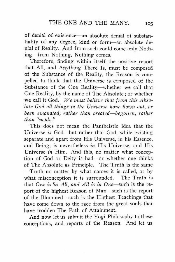 Therefore, finding within itself the positive report that All, and Anything There Is, must be composed of the Substance of the Reality, the Reason is compelled to think that the Universe is composed of the Substance of the One Reality --- whether we call that. One Reality, by the name of The Absolute; or whether we call it God. We must believe that from this Absolute-God all things in the Universe have flown out, or been emanated, rather than created --- begotten, rather than "made."