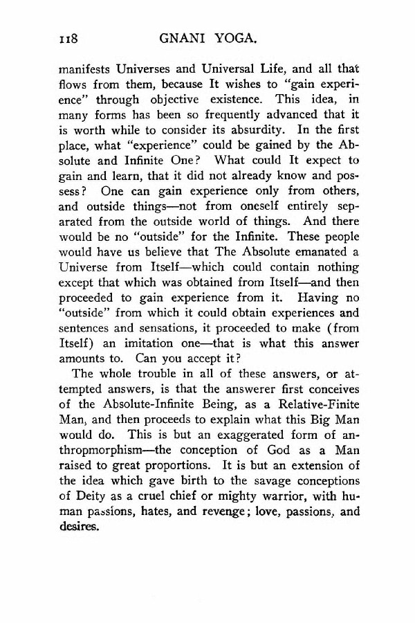 manifests Universes and Universal Life, and all that flows from them, because It wishes to "gain experience" through objective existence. This idea, in many forms has been so frequently advanced that it is worth while to consider its absurdity. In the first place, what "experience" could be gained by the Absolute and Infinite One? What could It expect to gain and learn, that it did not already know and possess? One can gain experience only from others, and outside things --- not from oneself entirely separated from the outside world of things. And there would be no "outside" for the Infinite. These people would have us believe that The Absolute emanated a Universe from Itself --- which could contain nothing except that which was obtained from Itself --- and then proceeded to gain experience from it. Having no "outside" from which it could obtain experiences and sentences and sensations, it proceeded to make (from Itself) an imitation one --- that is what this answer amounts to. Can you accept it?