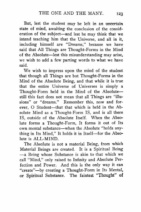 But, lest the student may be left in an uncertain state of mind, awaiting the conclusion of the consideration of the subject --- and lest he may think that we intend teaching him that the Universe, and all in it, including himself are "Dreams," because we have said that All Things are Thought-Forms in the Mind of the Absolute --- lest this misunderstanding may arise, we wish to add a few parting words to what we have said.