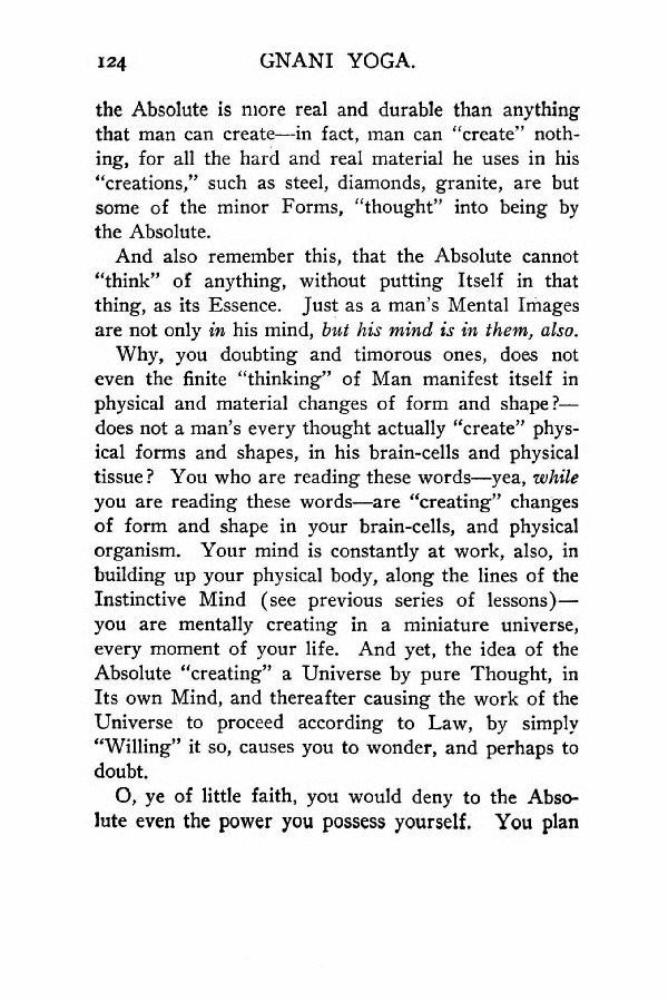 Why, you doubting and timorous ones, does not even the finite "thinking" of Man manifest itself in physical and material changes of form and shape? --- does not a man's every thought actually "create" physical forms and shapes, in his brain-cells and physical tissue? You who are reading these words --- yea, while you are reading these words --- are "creating" changes of form and shape in your brain-cells, and physical organism. Your mind is constantly at work, also, in building up your physical body, along the lines of the Instinctive Mind (see previous series of lessons) --- you are mentally creating in a miniature universe, every moment of your life. And yet, the idea of the Absolute "creating" a Universe by pure Thought, in Its own Mind, and thereafter causing the work of the Universe to proceed according to Law, by simply "Willing" it so, causes you to wonder, and perhaps to doubt.