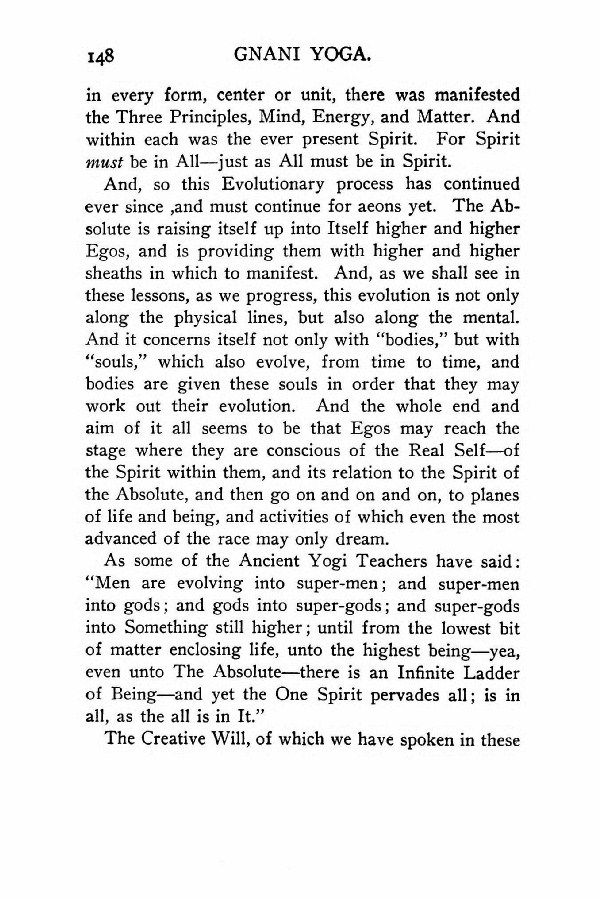 And, so this Evolutionary process has continued ever since ,and must continue for aeons yet. The Absolute is raising itself up into Itself higher and higher Egos, and is providing them with higher and higher sheaths in which to manifest. And, as we shall see in these lessons, as we progress, this evolution is not only along the physical lines, but also along the mental. And it concerns itself not only with "bodies," but with "souls," which also evolve, from time to time, and bodies are given these souls in order that they may work out their evolution. And the whole end and aim of it all seems to be that Egos may reach the stage where they are conscious of the Real Self --- of the Spirit within them, and its relation to the Spirit of the Absolute, and then go on and on and on, to planes of life and being, and activities of which even the most advanced of the race may only dream.
