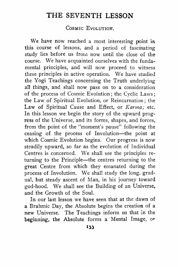 We have now reached a most interesting point in this course of lessons, and a period of fascinating study lies before us from now until the close of the course. We have acquainted ourselves with the fundamental principles, and will now proceed to witness these principles in active operation. We have studied the Yogi Teachings concerning the Truth underlying all things, and shall now pass on to a consideration of the process of Cosmic Evolution; the Cyclic Laws; the Law of Spiritual Evolution, or Reincarnation; the Law of Spiritual Cause and Effect, or Karma; etc. In this lesson we begin the story of the upward progress of the Universe, and its forms, shapes, and forces, from the point of the "moment's pause" following the ceasing of the process of Involution --- the point at which Cosmic Evolution begins. Our progress is now steadily upward, so far as the evolution of Individual Centres is concerned. We shall see the principles returning to the Principle --- the centres returning to the great Centre from which they emanated during the process of Involution. We shall study the long, gradual, but steady ascent of Man, in his journey toward god-hood. We shall see the Building of an Universe, and the Growth of the Soul.