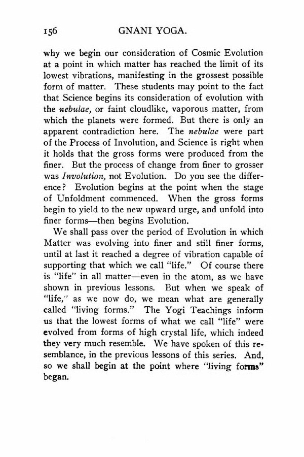 why we begin our consideration of Cosmic Evolution at a point in which matter has reached the limit of its lowest vibrations, manifesting in the grossest possible form of matter. These students may point to the fact that Science begins its consideration of evolution with the nebulae, or faint cloudlike, vaporous matter, from which the planets were formed. But there is only an apparent contradiction here. The nebulae were part of the Process of Involution, and Science is right when it holds that the gross forms were produced from the finer. But the process of change from finer to grosser was Involution, not Evolution. Do you see the difference? Evolution begins at the point when the stage of Unfoldment commenced. When the gross forms begin to yield to the new upward urge, and unfold into finer forms --- then begins Evolution.